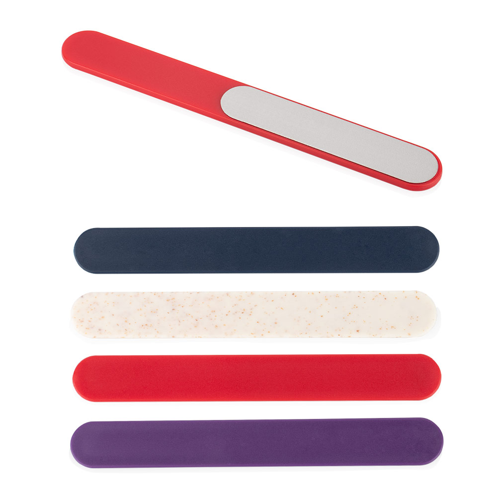 Lima para uñas fabricada en ABS con superficie de acero inoxidable, diseñada para ofrecer un limado preciso.