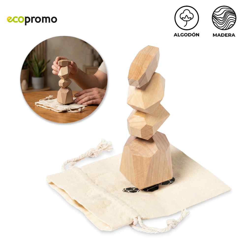 Juego didáctico de 4 piezas en madera natural con bolsa de algodón.