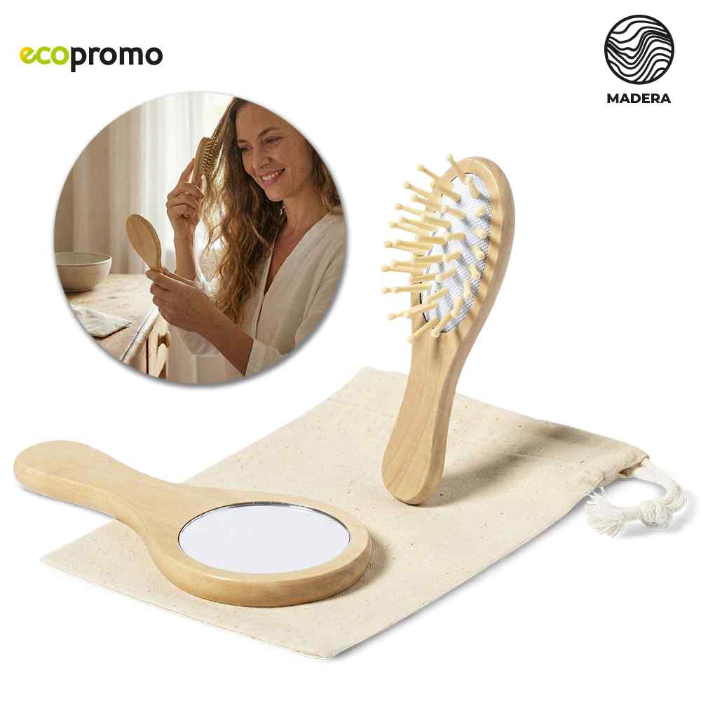 Set de espejo y cepillo en madera natural con bolsa de algodón.